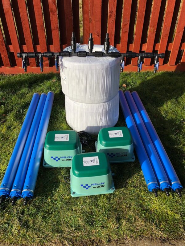 This kit supplies 600lr/min of air through 80m of self-weighted hose to 6 x 1 metre fine-bubble air diffusers. All fittings are included.