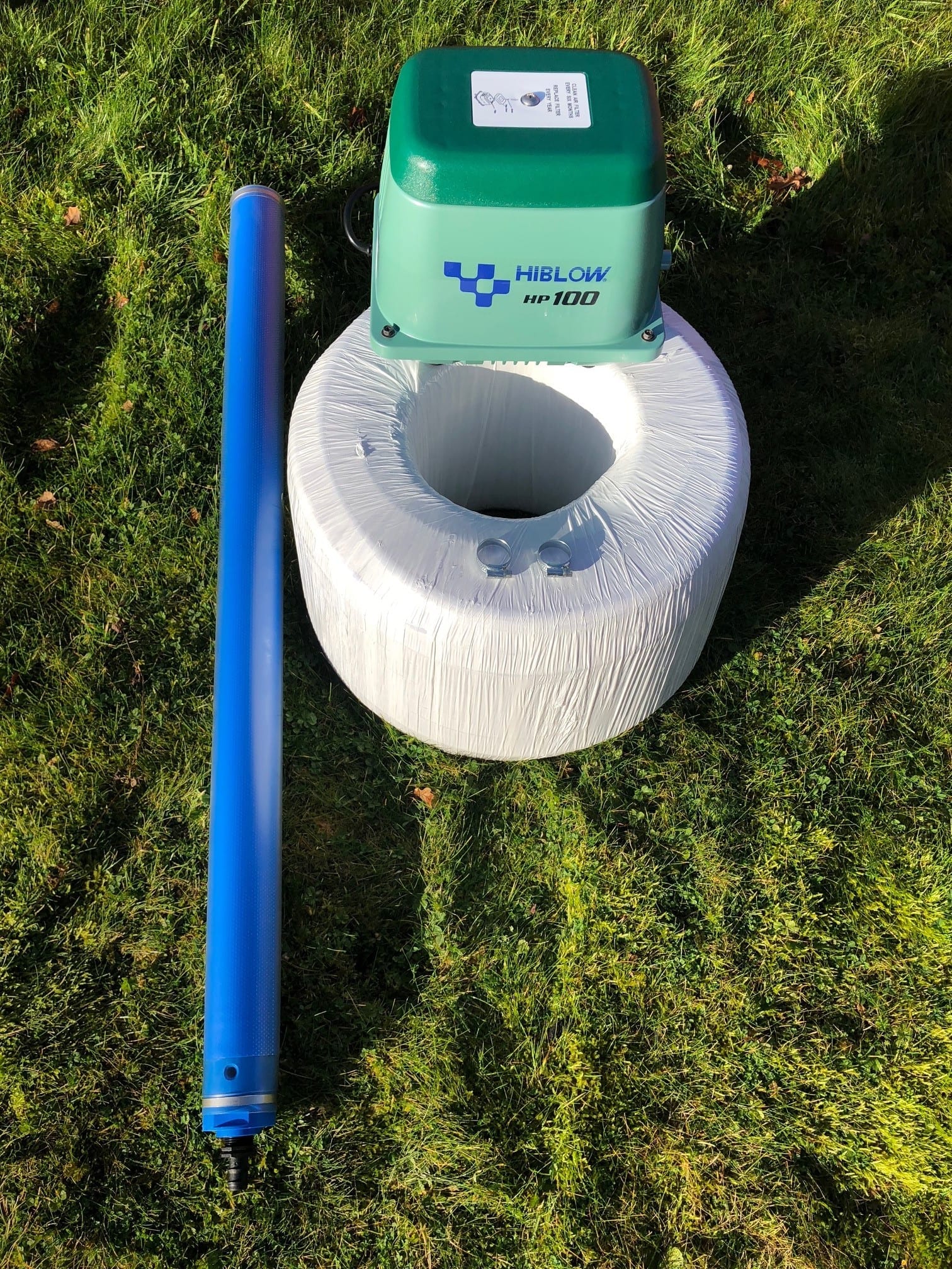 This kit supplies 100lr/min (6m3/hr) of air through 20m of self-weighted hose to a 1m fine-bubble air diffuser. All fittings are included.